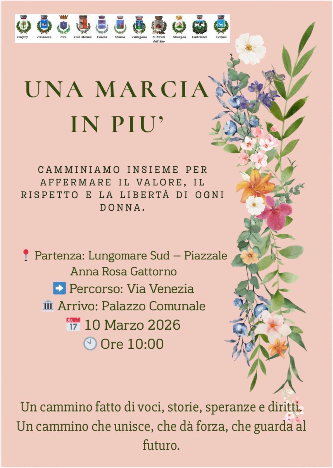 In occasione della celebrazione della feste delle donne l’ATS di Cirò Marina ha organizzato l’evento “Una marcia in più” per la promozione e valorizzazione del ruolo rivestito dalle donne nella società. Il 10.03.2026 alle ore 10.00 molte donne professioniste della nostra città marceranno insieme ad associazioni, scuole,  ed istituzioni  in rappresentanza di tutte le donne e del valore che ciascuna di esse apporta quotidianamente all’intera società. È previsto il raduno di tutti i partecipanti sul lungomare zona Sud, di fronte alla Statua Beata Anna Rosa Gattorno, dove si svolgerà una piccola rappresentazione teatrale al femminile, seguirà poi una marcia che attraverserà Via Togliatti, Via Venezia ed arriverà nelle adiacenze del Comune di Cirò Marina, qui ci sarà la piantumazione di un albero in memoria della D.ssa Francesca Mazza, una donna ed assistente sociale che ha prestato per anni servizio per l’Ambito territoriale sociale e l’inaugurazione della stanza di Segretariato sociale, interna al Comune, che verrà intitolata alla stessa, donna forte, resiliente ed appassionata del proprio lavoro.