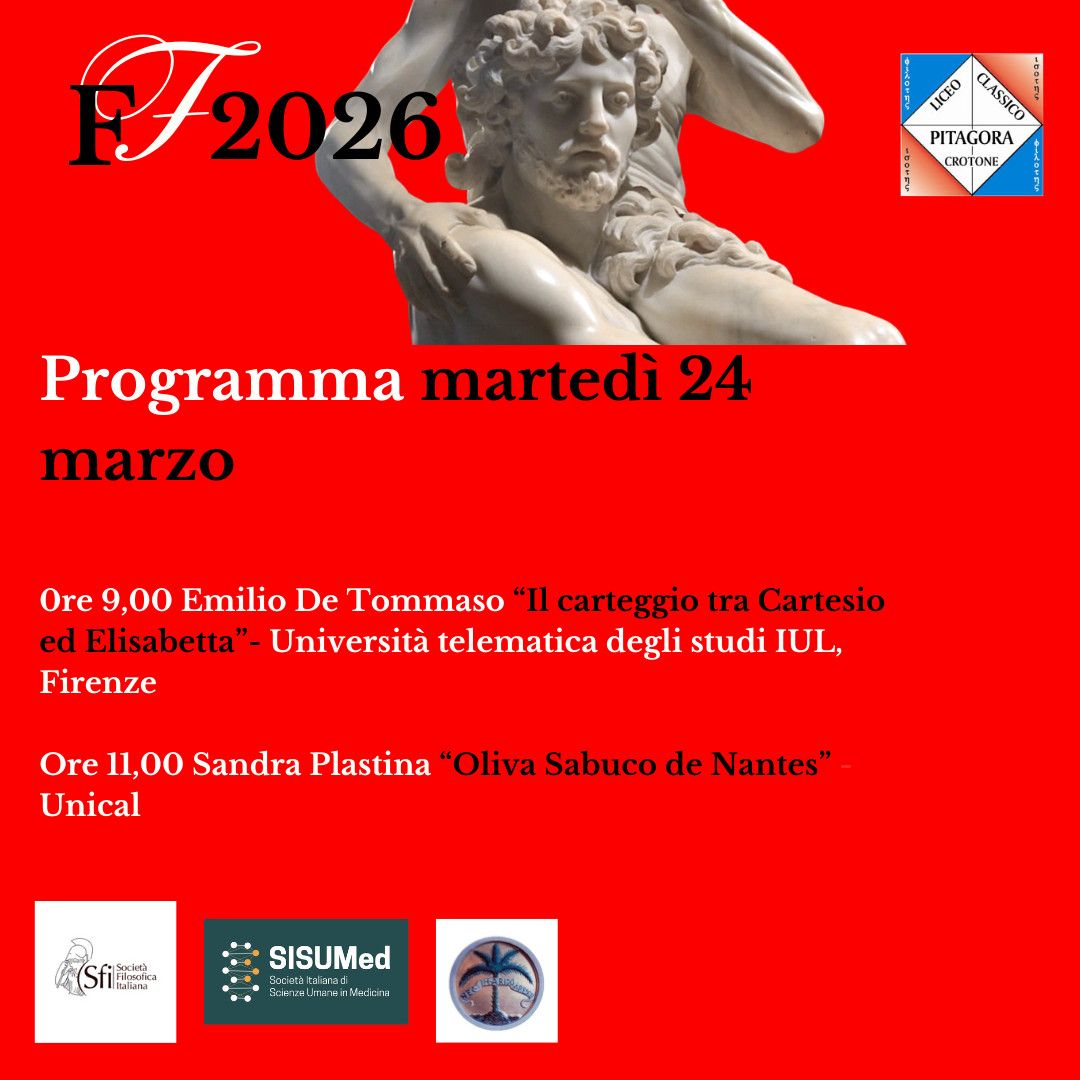 Il Festival della Filosofia 2026, giunto alla sua terza edizione, si svolge con il patrocinio della Società Filosofica Italiana (SFI), della Società Italiana di Scienze Umane e Medicina (SISUmed) e dell’Accademia di Storia dell’Arte Sanitaria (ASAS), a testimonianza del valore scientifico e culturale dell’iniziativa e dell’attenzione verso il dialogo tra saperi umanistici e discipline mediche.