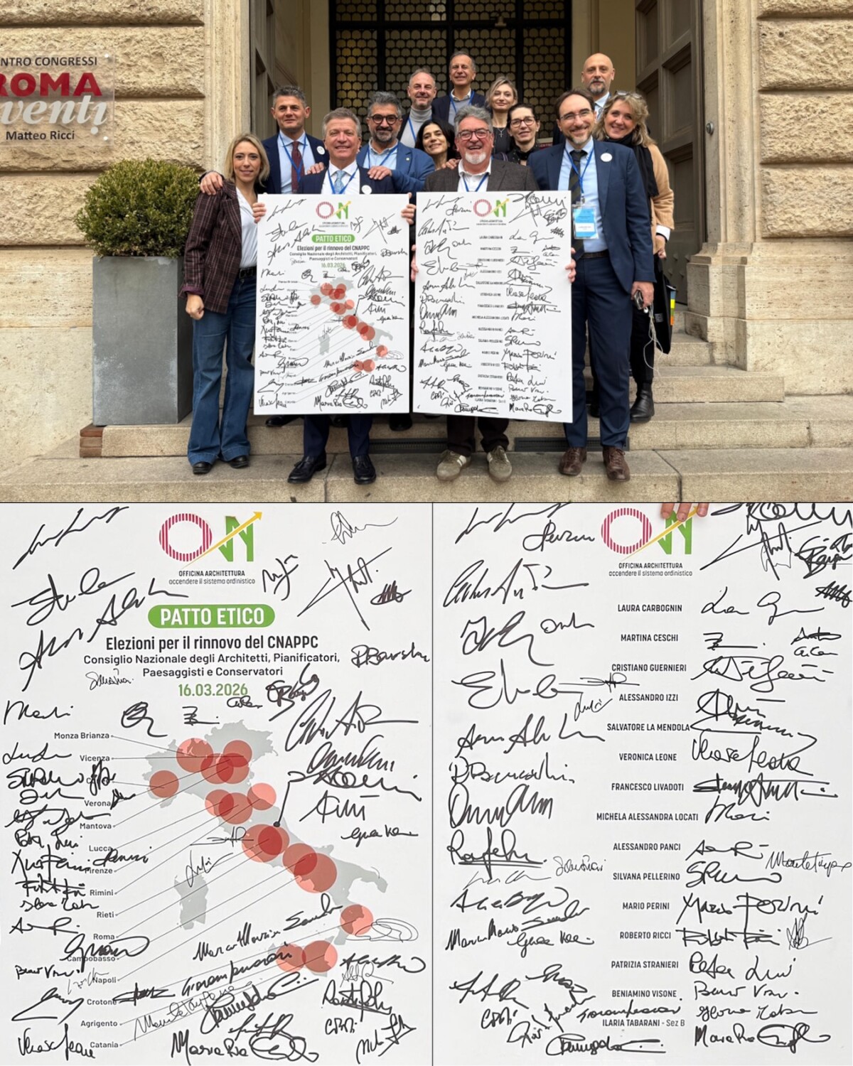 La vicepresidente Elisabetta Dominijanni ha ringraziato calorosamente sia il consiglio precedente che quello attuale per l’eccezionale lavoro di squadra che ha consentito la concretizzazione di questa straordinaria opportunità, sottolineando che solo facendo squadra si possono raggiungere traguardi importanti.Nei giorni 5-6 Marzo a Roma c/o la Sala Eventi Trevi, il Manifesto ed il programma sono stati presenti ufficialmente alla Conferenza Nazionale degli Ordini degli Architetti, al fine di convincere Presidenti e rappresentanti di tutta Italia a votare per la lista ON – OFFICINA ARCHITETTURA, ed a tal proposito tutti i candidati hanno sottoscritto un patto etico nel rispetto degli impegni che il gruppo assumerà in caso di vittoria delle elezioni.