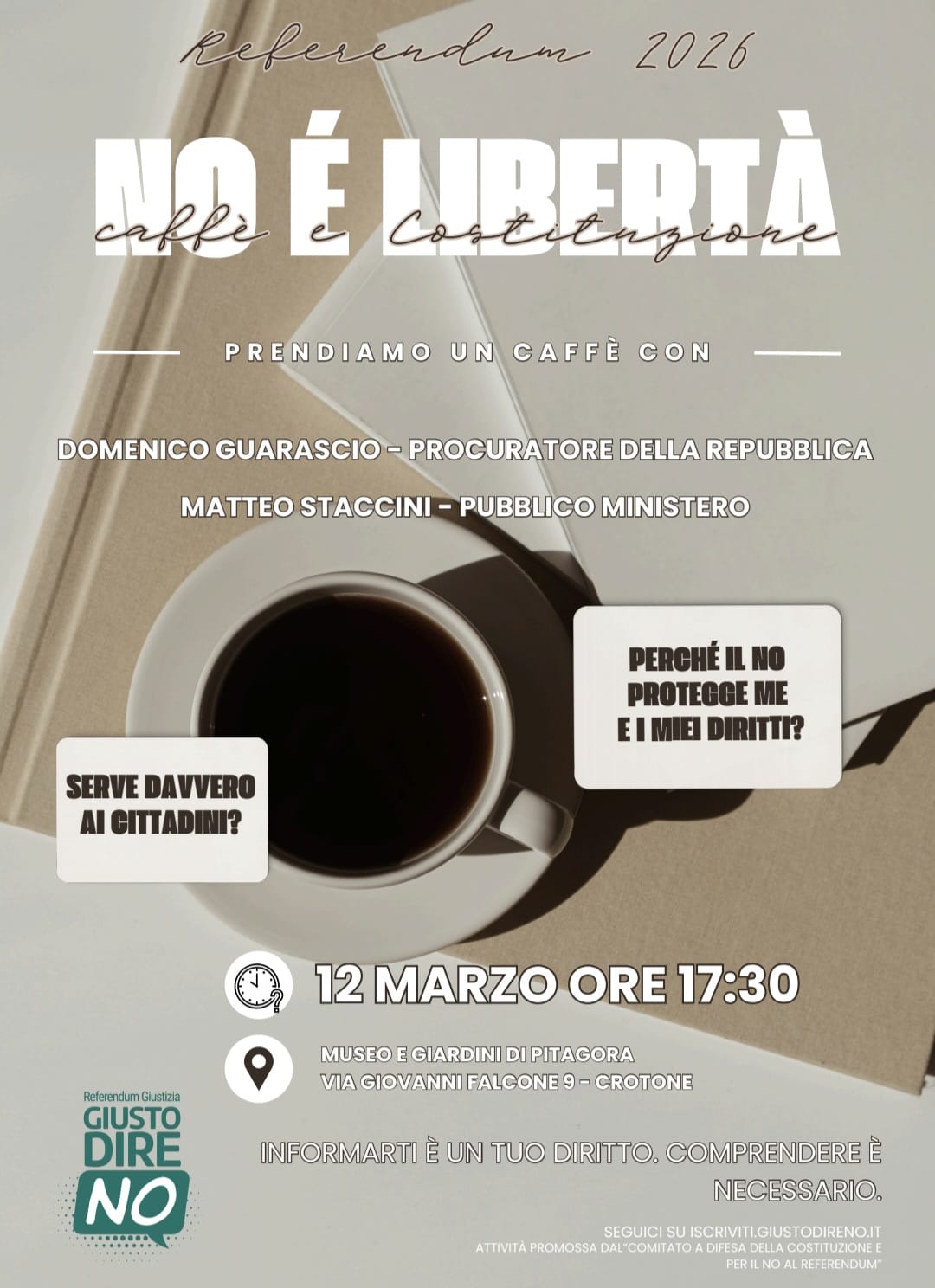 L’evento è aperto alla cittadinanza e si svolgerà in forma informale, davanti a un caffè, per favorire un clima di confronto diretto tra relatori e pubblico. 12 marzo – ore 17:30 al Museo e Giardini di Pitagora, Via Giovanni Falcone 9 – Crotone