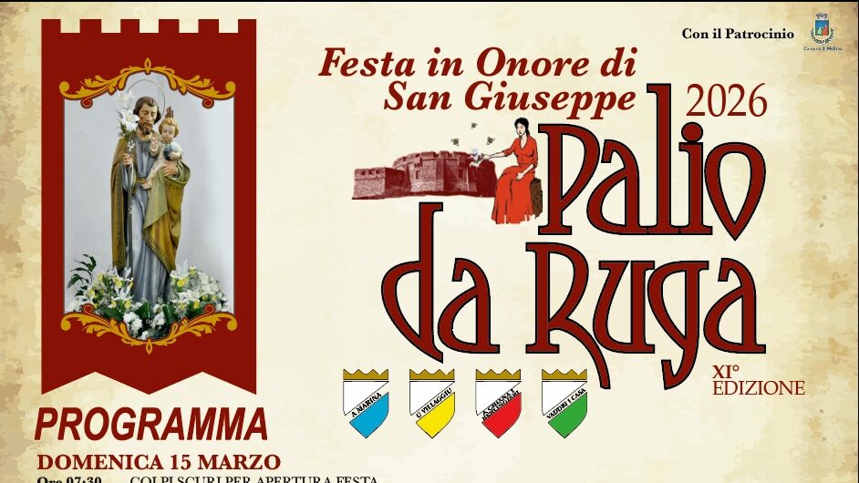Torre Melissa si prepara a vivere uno degli appuntamenti più sentiti della tradizione locale: la Festa in onore di San Giuseppe con il Palio da Ruga 2026, giunto alla XI edizione. L’evento, organizzato dall’Associazione Amici del Palio da Ruga con il patrocinio del Comune di Melissa, animerà il centro storico di Torre Melissa dal 15 al 19 marzo con un ricco programma di appuntamenti religiosi, culturali e folkloristici.
