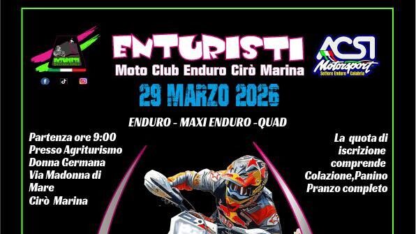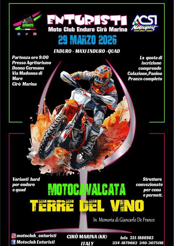 Tutto pronto per uno degli appuntamenti più attesi dagli appassionati delle due ruote e del fuoristrada: domenica 29 marzo 2026 torna la Motocavalcata “Terre del vino”, evento organizzato dal Moto Club Enturisti Cirò Marina, in collaborazione con ACSI Motorsport – Settore Enduro Calabria.