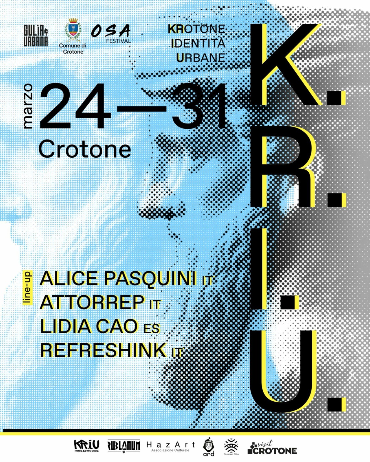 Dal 24 al 31 marzo torna KRIU – Krotone Identità Urbane, il progetto promosso dal Comune di Crotone in collaborazione con Gulia Urbana, che negli ultimi anni ha ridefinito il rapporto tra arte, spazio pubblico e comunità, trasformando la città in un luogo di incontro, immaginazione e nuove narrazioni urbane.Giunto alla sua terza edizione, KRIU continua il suo percorso di ricerca e intervento artistico sul territorio, intrecciando arte urbana e partecipazione attiva. Un processo che nel tempo ha lasciato segni concreti e duraturi nella città, contribuendo a costruire connessioni, stimolare dialoghi e aprire nuove prospettive sul vivere urbano.Anche quest’anno, quattro artisti porteranno a Crotone linguaggi, esperienze e visioni differenti: Alice Pasquini (Italia), Attorrep (Italia), Lidia Cao (Spagna) e Refreshink (Italia).