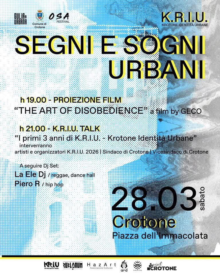 KRIU rappresenta una visione concreta di città: inclusiva, creativa e capace di valorizzare il proprio patrimonio attraverso linguaggi contemporanei” dichiara il vicesindaco Sandro CretellaNell’ambito dell’iniziativa è previsto anche un evento speciale: sabato 28 marzo in Piazza dell’Immacolata, alle ore 19:00, la proiezione del film “The Art of Disobedience” by GECO e, a seguire, alle ore 21:00 il “K.R.I.U. Talk” – “I primi 3 anni di KRIU – Krotone Identità Urbane”, con artisti, organizzatori e rappresentanti istituzionali.A conclusione della serata, DJ set con La Ele Dj (Reggae/Dancehall) e Piero R (Hip Hop).KRIU 2026 è un processo in continua evoluzione. È una città che si racconta attraverso segni, presenze e visioni. È uno spazio in cui riconoscersi, incontrarsi e lasciare tracce condivise.