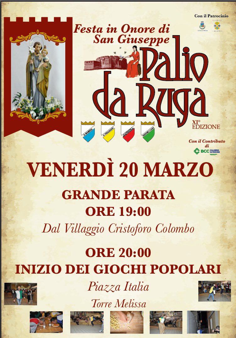 Il Palio da Ruga si conferma negli anni uno degli eventi più caratteristici del territorio, capace di valorizzare il patrimonio culturale e religioso di Torre Melissa. Tra rievocazioni storiche, musica popolare e momenti di forte partecipazione, la festa continua a rappresentare un legame autentico con le radici e con la devozione a San Giuseppe, coinvolgendo intere generazioni e attirando visitatori da tutta la Calabria.
