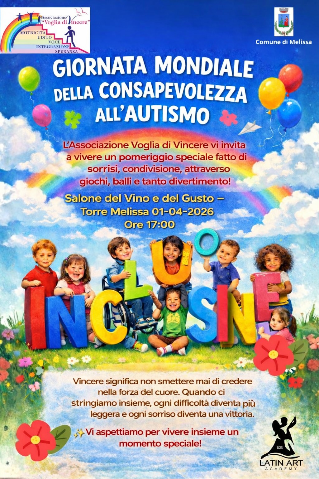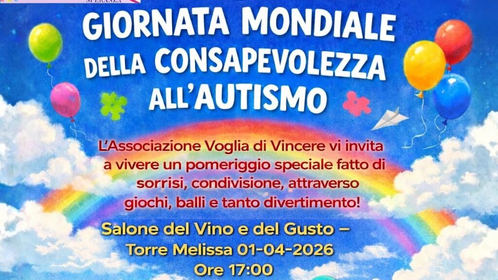 Un pomeriggio all’insegna dell’inclusione, della condivisione e della sensibilizzazione. In occasione della Giornata Mondiale della Consapevolezza sull’Autismo, in programma il prossimo 1° aprile, l’associazione Voglia di Vincere – Sportello Amico Autismo promuove un evento aperto alla cittadinanza presso il Salone del Vino e del Gusto di Torre Melissa, con inizio alle ore 17:00.